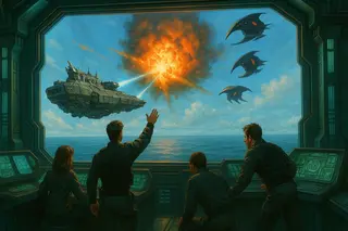корабль с людьми Атлантиды преследуют и готов добить рейфы.