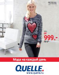 ![]() В заключительной коллекции сезона Осень-Зима 2012: модный норвежский узор, жакеты в стиле Шанель в сочетании с джинсами и обувью на высоком каблуке, объемные шарфы или классический свитер поверх любимого платья. Одевайтесь под цвет своего настроения вместе с каталогом QUELLE! |