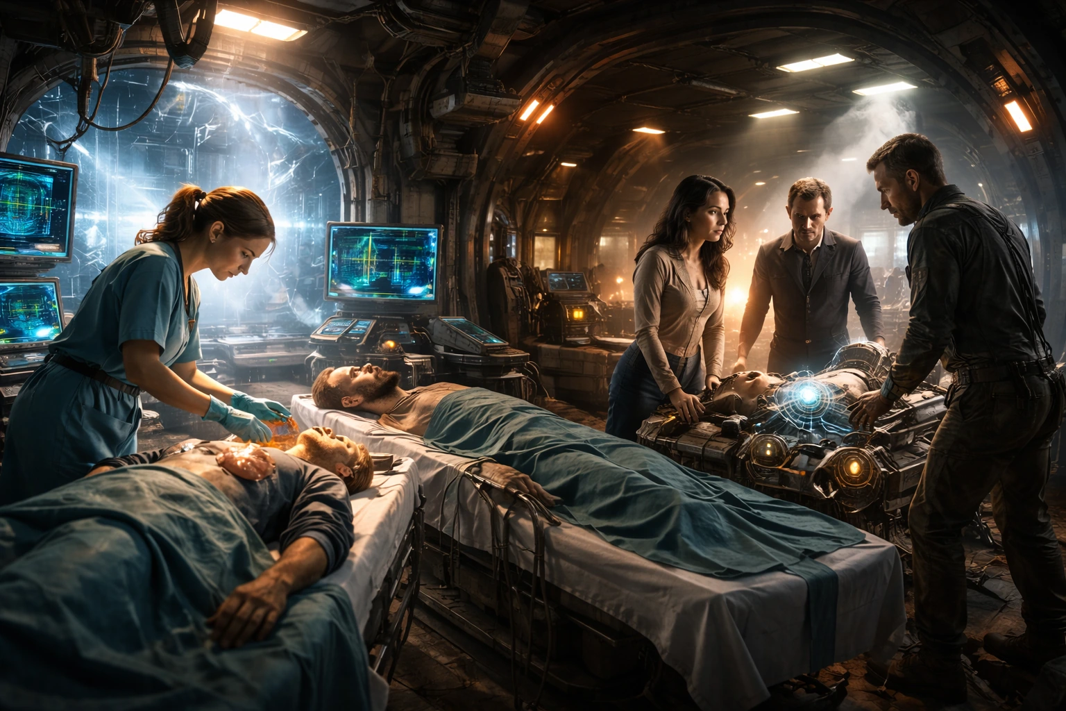 Донорський пошук дає відчуття лотереї, але врешті знаходяться сумісні кандидати, і Грір добровільно стає донором майже без пафосу — просто як людина, що вирішила, що так правильно. І тут серія робить дуже правильний хід: вона не перетворює це на “героїчну промову”. Грір не стає святим, Волкер не стає “обраним”. Вони просто двоє людей, яким не пощастило бути на кораблі без лікарні — і які намагаються вистояти. Сцена з садом: простір, де “надія” стає видимоюОдна з найтепліших сцен епізоду — коли Грір тягне Волкера в сад «Долі», щоб показати йому “подвір’я” і зорі — майже домашній аналог телескопа з минулого життя Волкера. (лінії про сад і спогади Волкера) Це дуже проста драматургія, але вона працює: “надія” не як гасло, а як коротка пауза, коли ти знову відчуваєш, що живеш, а не просто виживаєш. Кульмінація: дві операції, один корабель і збій, який міг убити всіхКульмінація епізоду — монтаж двох процесів: