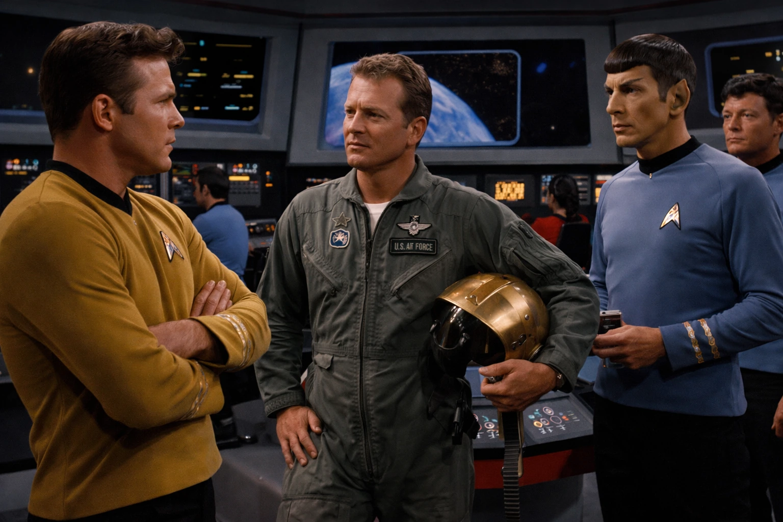 Коли на перехоплення “НЛО” піднімають винищувач F-104, а пілот (капітан Джон Крістофер) отримує шанс побачити «Ентерпрайз» зблизька, серія моментально підкручує ставки. Кирк боїться, що літак може бути озброєний ядерною зброєю, наказує застосувати тракторний промінь, і це призводить до аварії винищувача. Щоб урятувати пілота, його телепортують на борт. (Вікіпедія) І тут дуже гарно видно одну з сильних рис TOS: добрий намір і технологічна перевага можуть створити катастрофу, якщо контекст не твій. Для «Ентерпрайза» тракторний промінь — інструмент контролю. Для літака XX століття — смертельний фактор. Серія не моралізує це прямо, але відчуття “ми врятували людину, одночасно зруйнувавши їй реальність” працює дуже сильно. Джон Крістофер: не просто “гість із минулого”, а людський центр епізодуКапітан Джон Крістофер — одна з причин, чому «Завтра — це учора» досі приємно дивитися. Він не карикатурний “військовий із минулого”, який тільки дивується кнопкам і дверям. Він швидко орієнтується, тримається гідно, ставить правильні питання і поводиться як професіонал, який потрапив у неможливу ситуацію. Саме через нього серія перестає бути просто вправою в часових парадоксах. Вона стає історією про людину, яку вирвали з власної епохи: