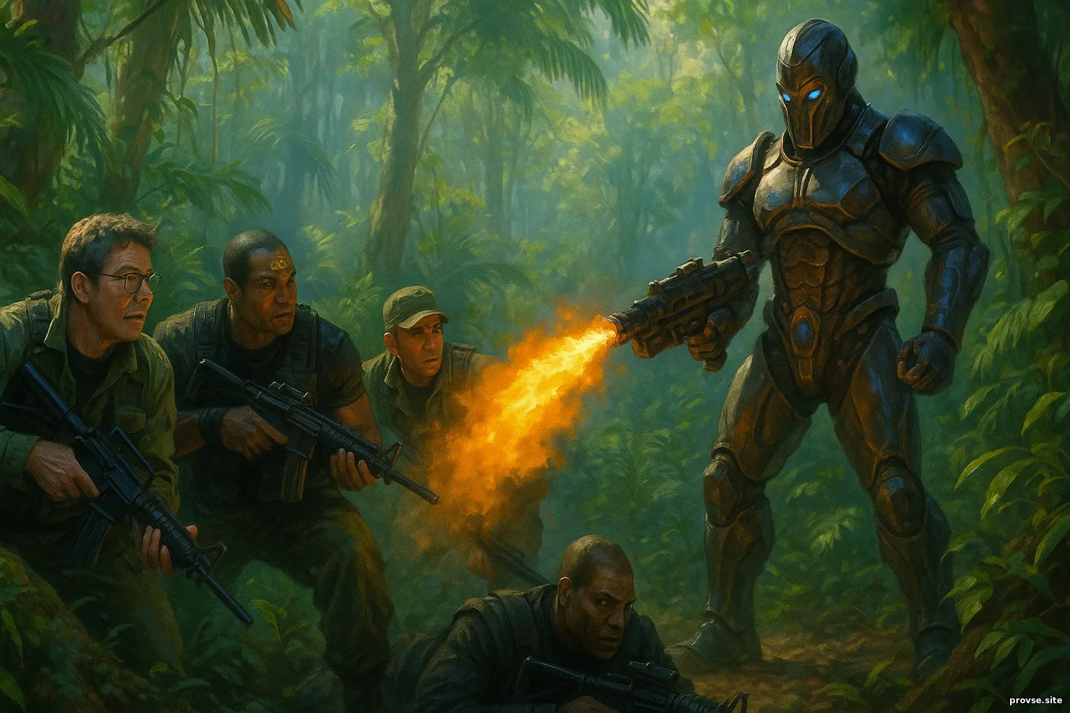 Контраст между блестящей бронёй сверхвоинов и зеленью джунглей подчёркивает дуализм природы и технологии.